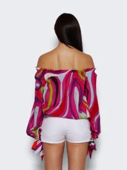 - Elasticized drawstring neckline can be worn on and off-shoulders