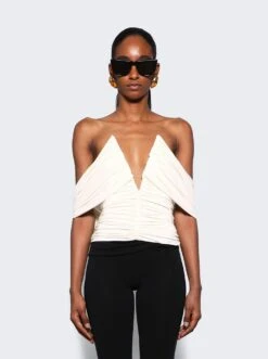 - Deep V neckline