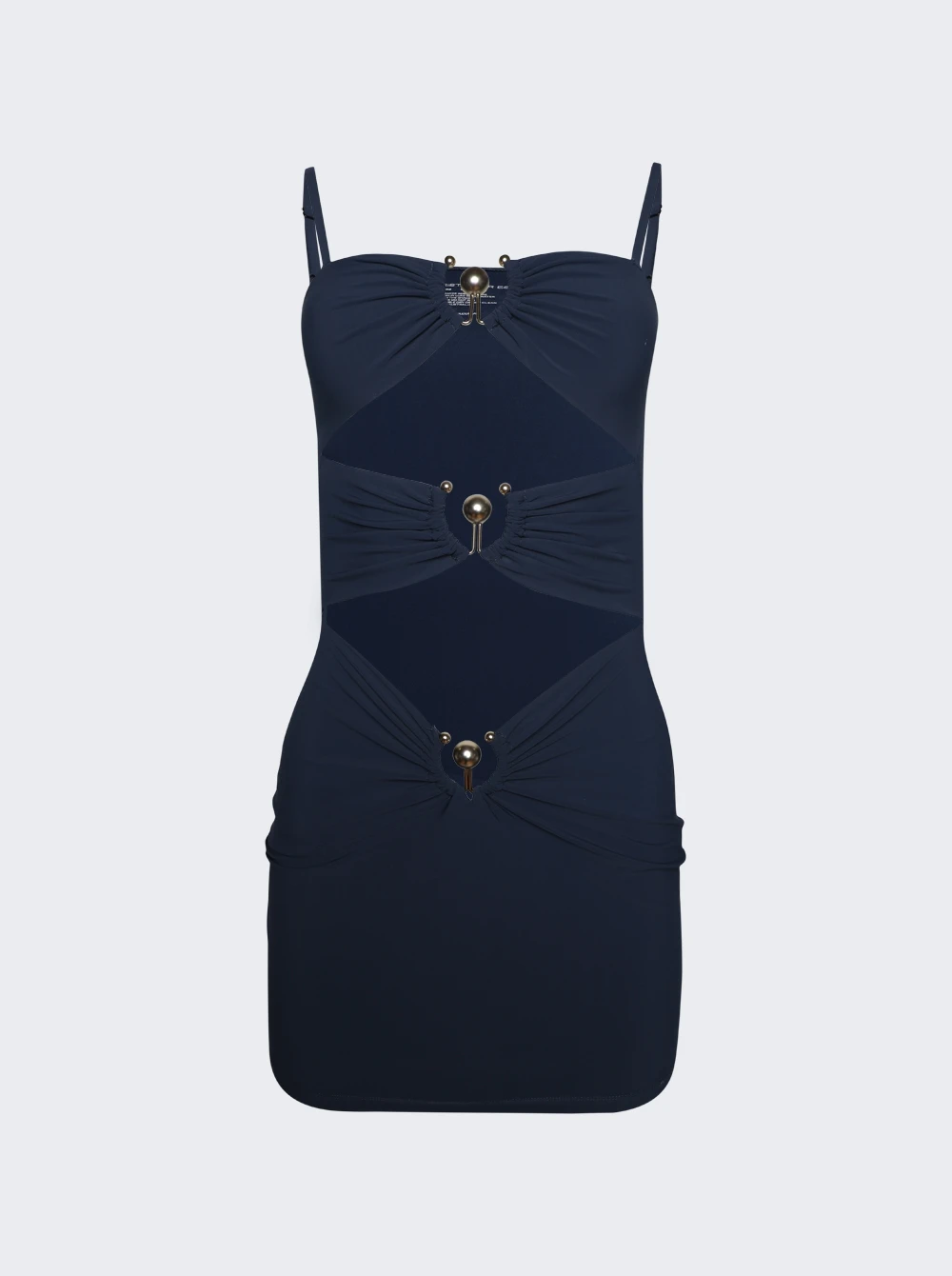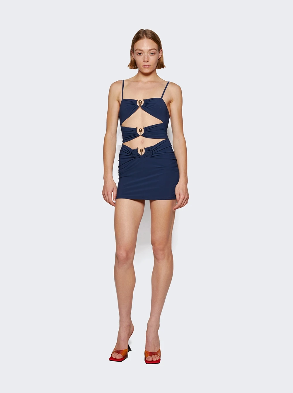 - Cutouts and sculptural hardware at front